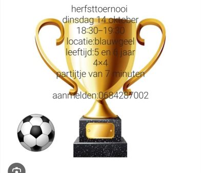 Marcella Diallo organiseert de 2e editie Herfsttoernooi. Voor 5 en 6 jarige op dinsdag 14 oktober 2025 van 18:30-19:30. Locatie: Sportpark Blauw Geel’38. Voor leden en niet-leden en vriendjes...