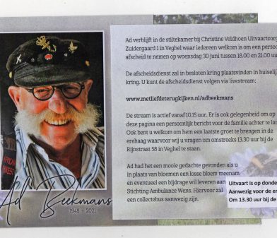 In memoriam Ad Beekmans VEGHEL | Met een glimlach op het gezicht vertrok Ad Beekmans vrijdag uit het leven. Met 73 jaar laat de Veghelaar en vooral Blauwgeler een...