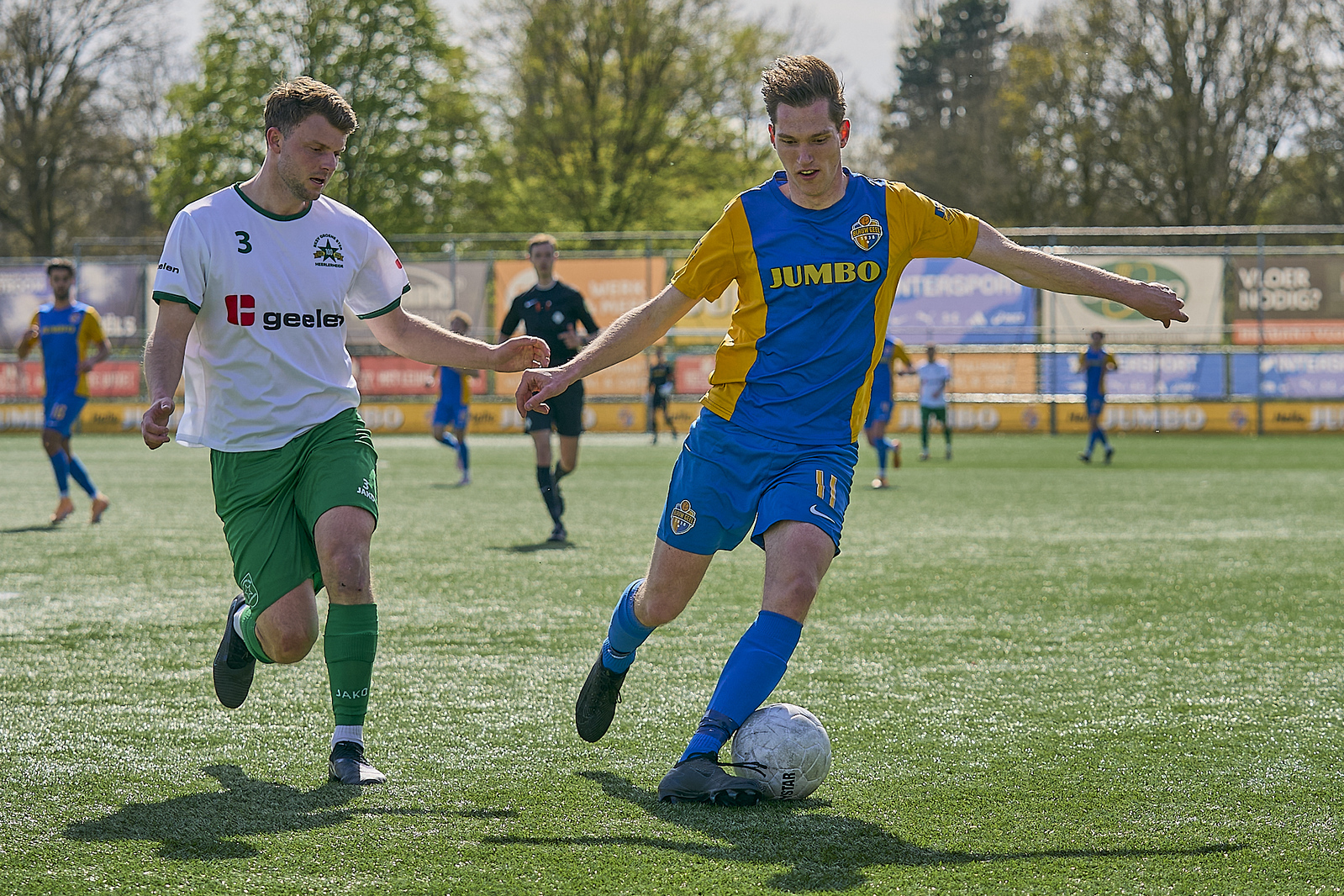 Op een zonovergoten sportpark was Blauw Geel al binnen de minuut gevaarlijk. Bij 26 seconde kreeg men al een corner en Joep Munsters plaatste de bal vanaf de cornervlag zo op de lat. In de 6e minuut een eerste corner voor de gasten maar een speler bij de tweede paal plaatste de bal uit deze corner recht in de handen van doelman Jordy Zielschot. In de 13e minuut wederom uit een corner van Groene Ster was het Lars Loermans die de ingedraaide bal weg kopte tot een ingooi voor Groene Ster. In de 24e minuut de eerste echte grote uitgespeelde kans. Mitchel van Rosmalen wordt in kansrijke positie aangespeeld maar schiet de bal huizen hoog over. Zes minuten later stoomt Joep Munsters op vanaf het half veld om vervolgens Koen van der Zanden aan te spelen. Koen heeft genoeg ruimte maar plaatst de bal verre van gericht genoeg voor ene doelpunt en daarom is de doelman de lachende derde. Maar…. Een minuutje later is het wel raak. Mitchel van Rosmalen rond vanaf afstand beheerst en mooi af, de Groene Ster doelman kansloos latend: 1-0. Verdiend was deze voorsprong Zeker want twee eerdere grote kansen waren nog niet benut. In de 38e minuut goed storend werk van Koen van der Zanden waardoor Blauw Geel bij het strafschopgebied van Groene Ster al in balbezit komt. Hij geeft vervolgens de bal goed voor op Mitchel van Rosmalen die zijn derde grote kans krijgt. Helaas raakt hij de bal compleet verkeerd en daardoor gaat de bal over het lege doel. In de 41 minuut wordt de score verder opgevoerd. Lars Loermans lijkt in een duel met twee tegenstanders de bal te verliezen maar op eigen inzet blijft hij in balbezit om vervolgens met een prima schot de bal in het doel te schieten: 2-0. Twee minuten later een goede en snelle Veghelse aanval. Sjoerd Schobbers zet goed voor vanaf zijn flank maar met een elegante duik kan de Groene Ster doelman de bal pakken. Blauw Geel gaat rusten met een comfortbel ogende 2-0 voorsprong ook omdat Groene Ster geen vuist wist te maken voor de rust.