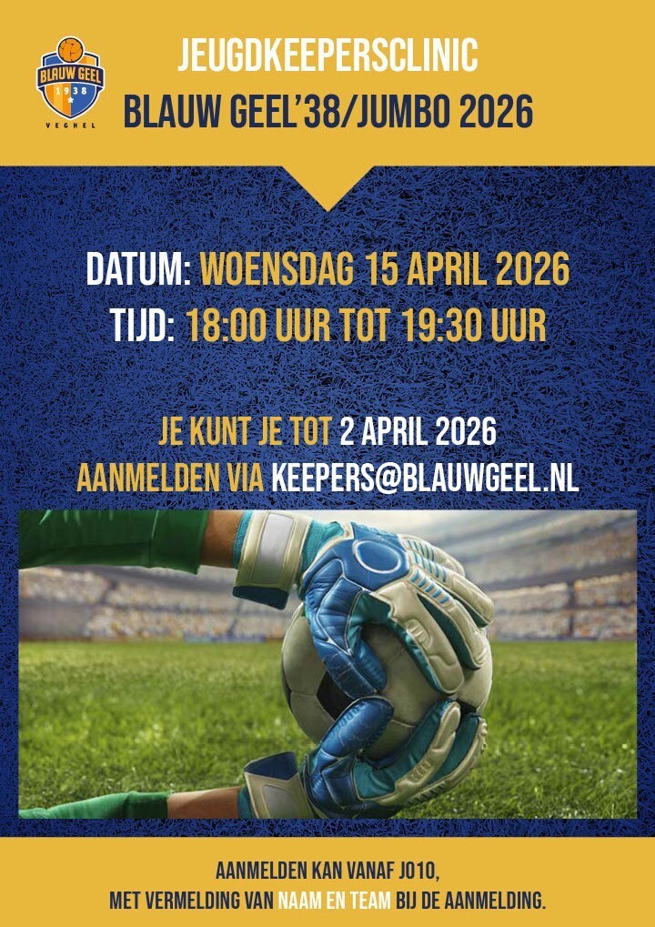 Op woensdag 15 april 2026 organiseert Blauw-Geel’38/JUMBO een keepersclinic, speciaal voor jeugdkeepers. Dit is de kans om je vaardigheden te verbeteren onder leiding van ervaren keeperstrainers. De trainer en de keeperstrainer van ons vaandelteam zijn ook aanwezig.