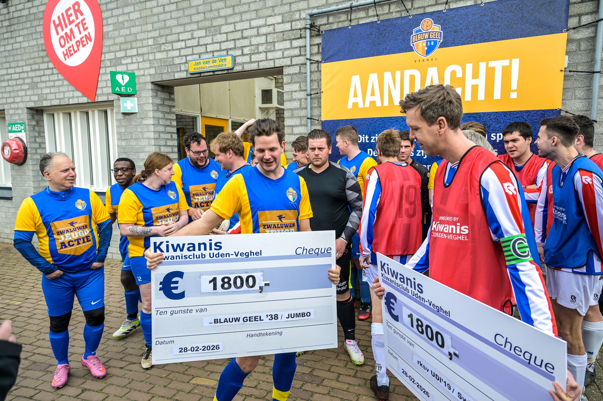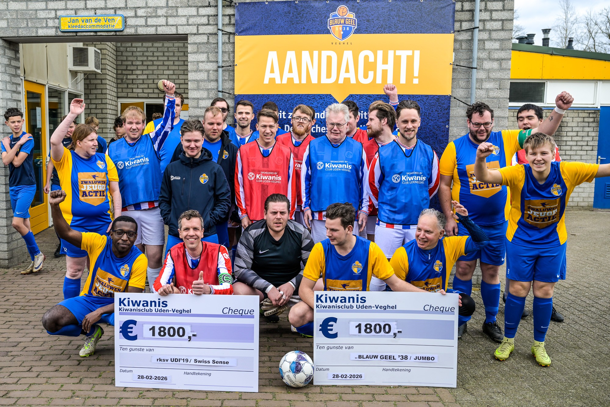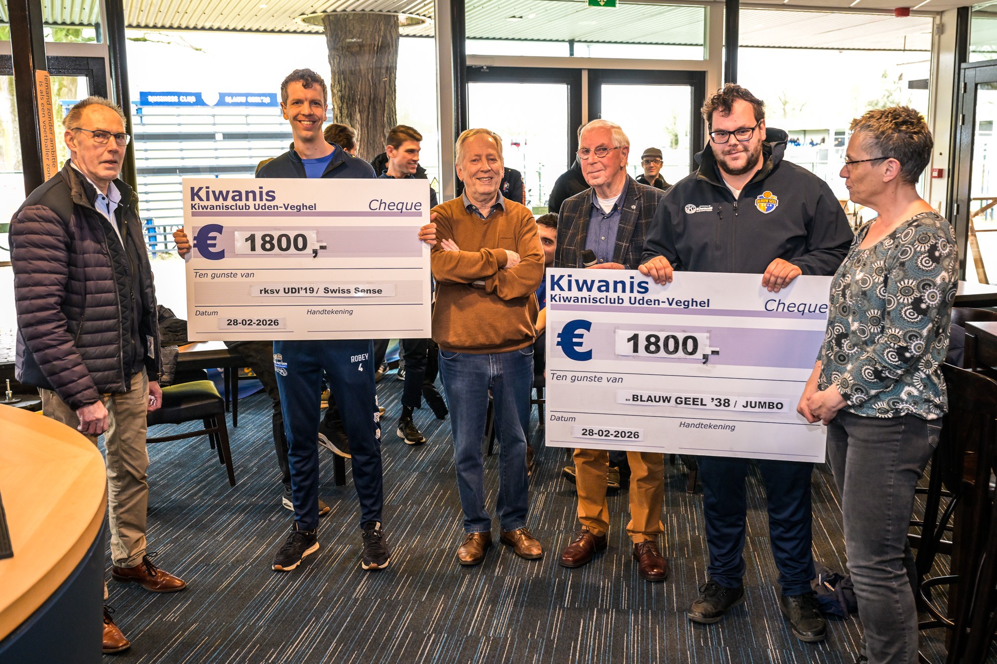 VEGHEL/UDEN – De G-teams van sv Blauw Geel ’38 / JUMBO en rksv UDI’19/Swiss Sense zijn afgelopen zaterdag 28 februari flink in het zonnetje gezet. Dankzij een succesvolle champagne-actie van Kiwanisclub Uden-Veghel ontvingen beide teams een cheque van maar liefst € 1.800,-.