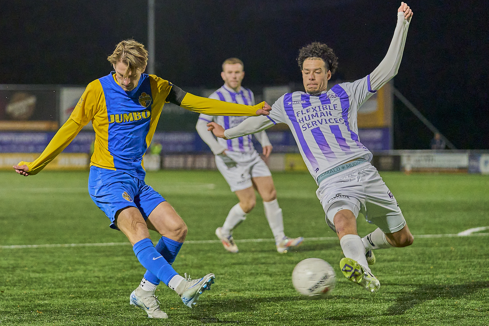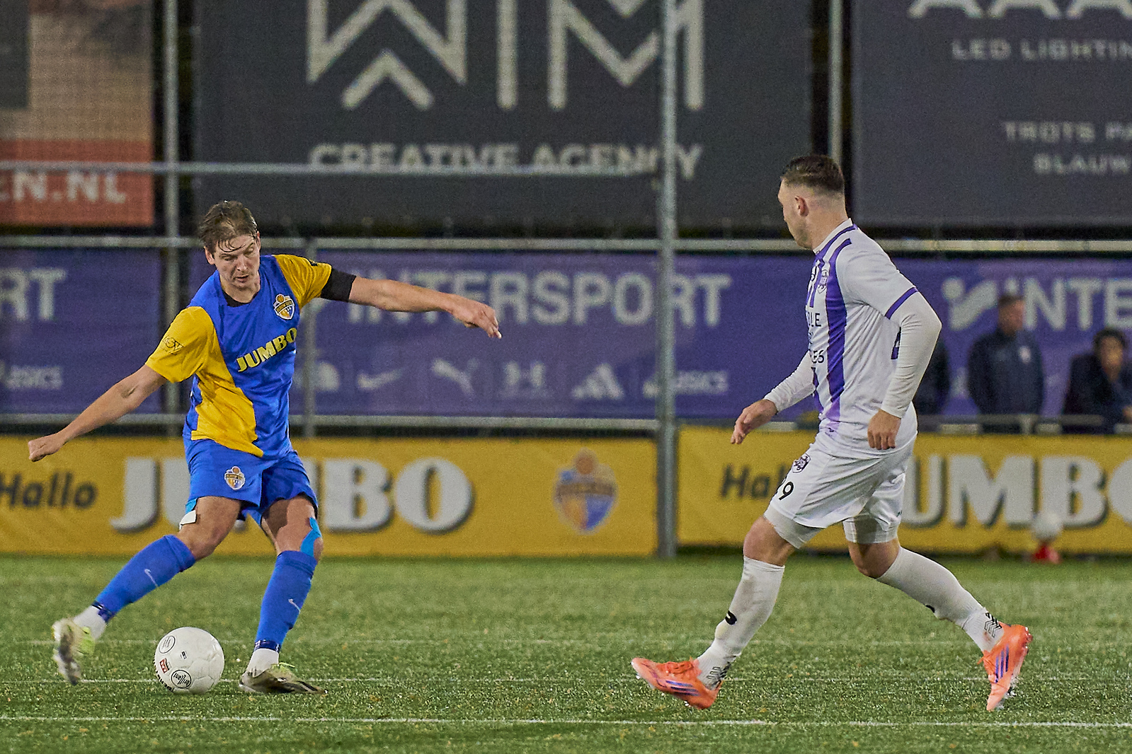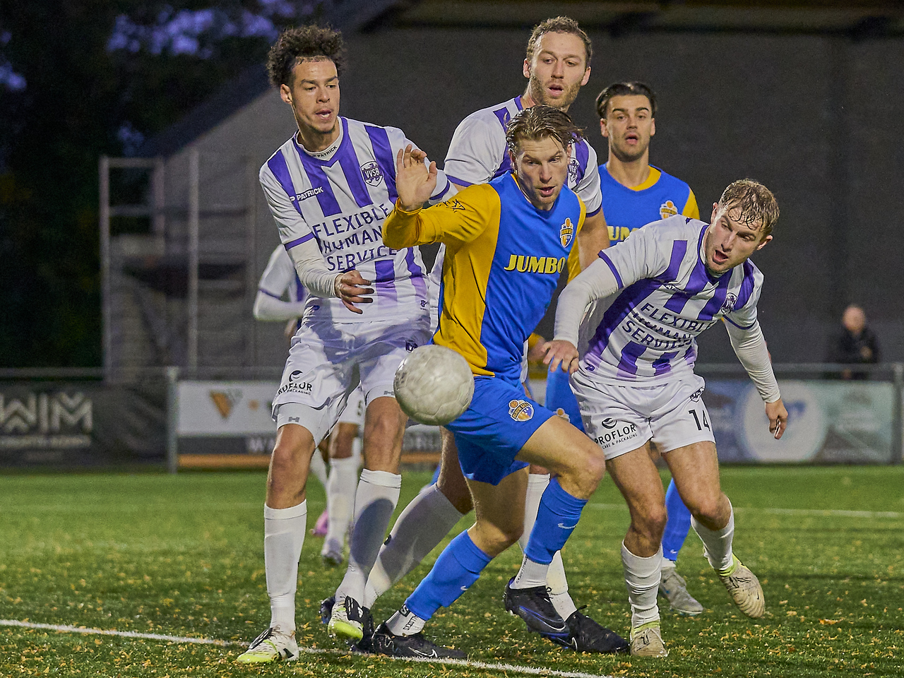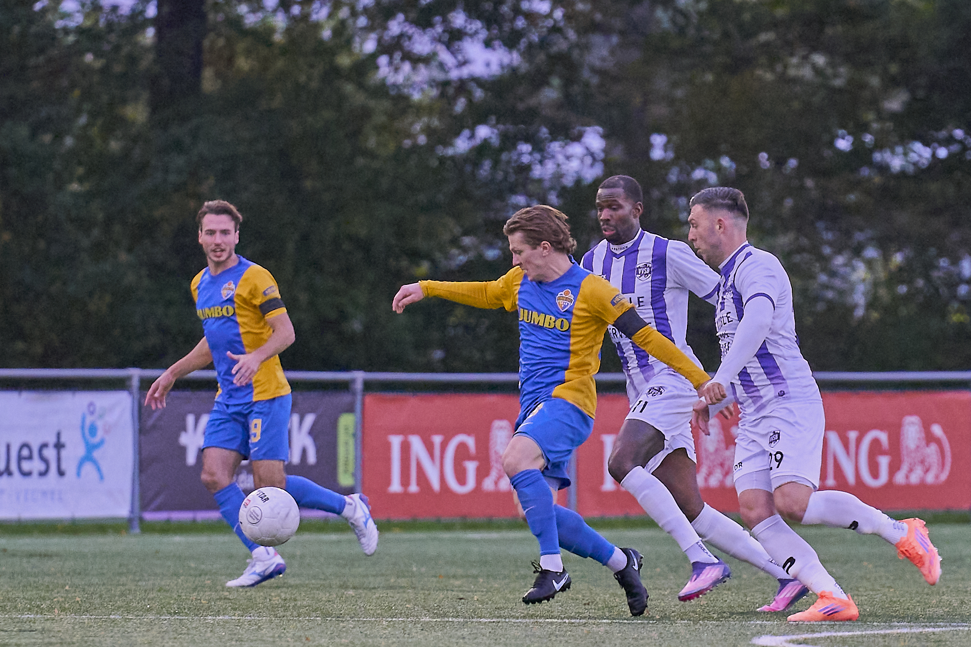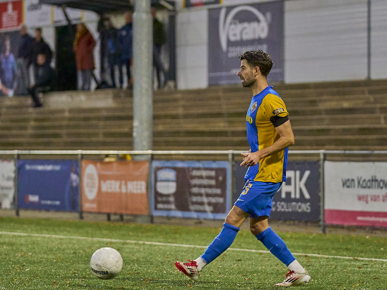 Herfst in al zijn facetten vanavond op het Prins Willem Alexander sportpark, vallende bladeren, harde en koude wind en regen: herfstachtiger kun je het niet hebben. Op bezoek het Noordwijkhoutse VVSB, voluit Voetbal Vereniging Sint Bavo. Blauw Geel een VVSB, ze komen elkaar vanavond voor de vijfde keer tegen. In het seizoen 22-23 won Blauw Geel thuis met 3-2 om daarna uit met 3-2 te verliezen. Afgelopen seizoen won met uit met de spectaculaire uitslag van 3-5 en thuis daarna met liefst 4-0 te winnen van VVSB. Thuis dus nog steeds de honderd procent score tegen VVSB. Het zijn mooie statistieken maar natuurlijk ook niet meer dan dat, voor wat het waard is. De ploeg van trainer Arjan de Zeeuw, dit seizoen bezig aan zijn eerste seizoen bij VVSB, bezet een vijfde plaats met een wedstrijd minder en drie punten minder dan nummer drie Bauw Geel. Het duel van BAVO (bijnaam) afgelopen week kon namelijk niet worden uitgespeeld bij een 3-0 oorsprong voor de Paars/Gelen tegen ASWH als gevolg van een blessure van de Arbiter. Vanavond dus eigenlijk een rechtstreeks duel om de derde plaats op de ranglijst. VVSB leed in de voorgaande negen duels slechts 1 nederlaag, thuis tegen Kloetinge (1-2) maar speelde wel al vier keer gelijk en kwam vier keer tot winst. In de vijf gespeelde uitwedstrijden kwam het twee keer tot winst, de eerste twee uitwedstrijden werden beide gewonnen met 1-2, bij UNA en Scheveningen. Daarna drie gelijke spelen. Blauw Geel verloor zijn laatste twee thuiswedstrijden, Derby’s, en verloor al drie keer in totaal. Uiteraard snakt men weer naar winst in eigen huis. Afgelopen week werd wel in Meerssen de plaatselijke sv met 2-4 aan de kant geschoven. Daarbij lijken de blessures van belangrijke spelers goed te herstellen en heeft trainer Maurice Verbunt dus weer wat meer keuzemogelijkheden in zijn niet al te brede selectie.