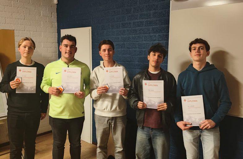 BlauwGeel’38/JUMBO is weer een aantal vereniging scheidsrechters rijker. We mogen als vereniging zeker blij zijn met onze groep scheidsrechters. Het animo om scheidsrechter te worden is de laatste jaren erg toegenomen. Na het begin bij de pupillen en de cursus is het voor degene die dat willen ook de cursus voor vereniging scheidsrechter. Een vijftal enthousiaste jongens had zich hiervoor opgegeven. Na een paar cursusavonden en een aantal wedstrijden onder begeleiding was het tijd voor de laatste cursusavond. We zijn dan ook erg blij dat Jens André, Jannick Hubers, Levi Versteegh, Malek Zakarneh en Niels van Heeswijk de cursus met goed gevolg hebben afgerond en het daarbij behorende diploma in ontvangst hebben mogen nemen. Wij feliciteren hen dan ook van harte!