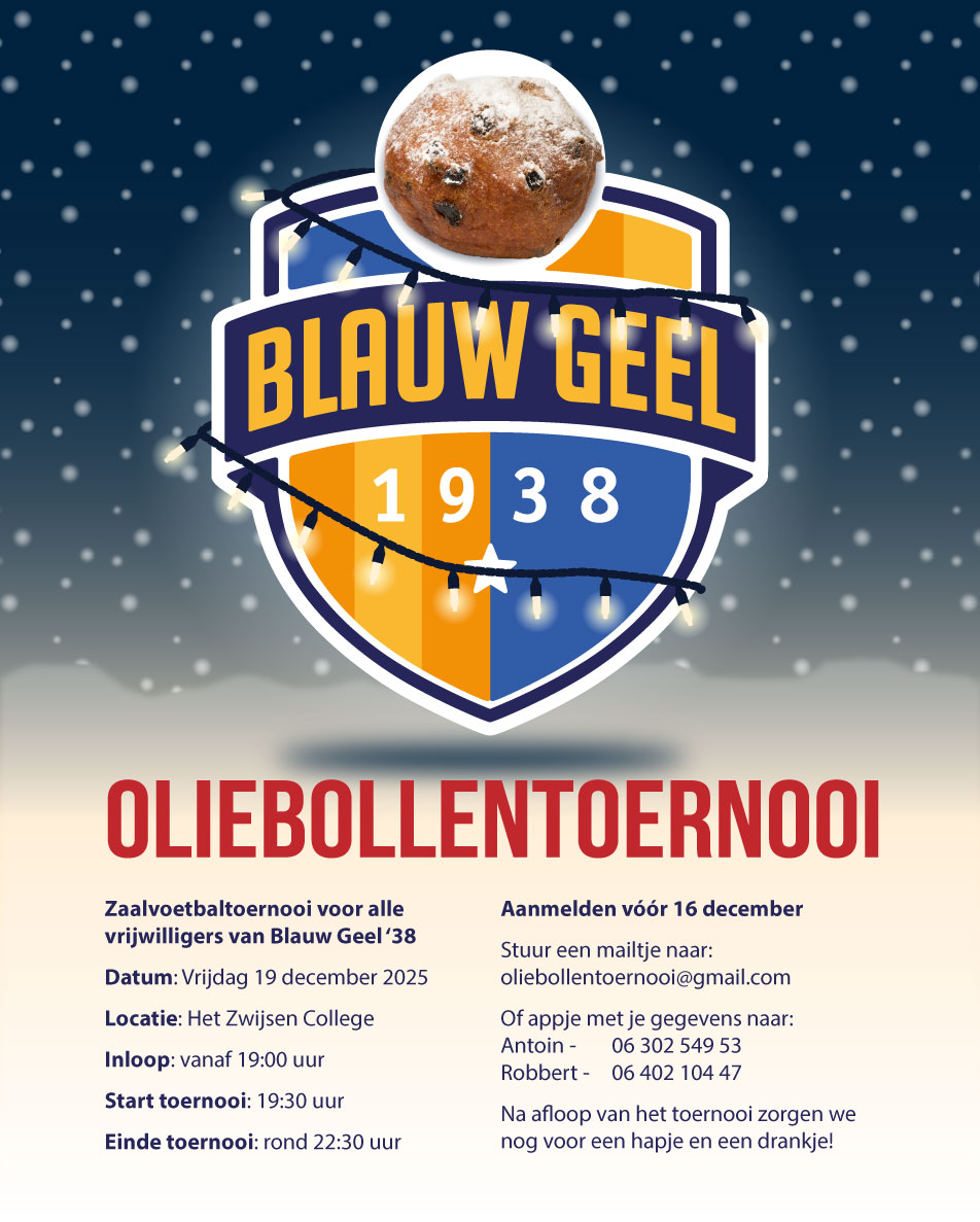 Dit gezelligheid-zaalvoetbaltoernooi is voor alle vrijwilligers van Blauw Geel. Iedere vrijwilliger mag zich opgeven om mee te spelen, te coachen, te fluiten of te supporteren. Het toernooi start op vrijdagavond 19 december om 19.00 uur in HET ZWIJSEN en zal rond 23.00 uur zijn afgelopen.